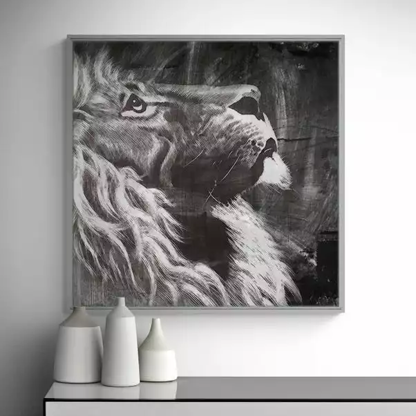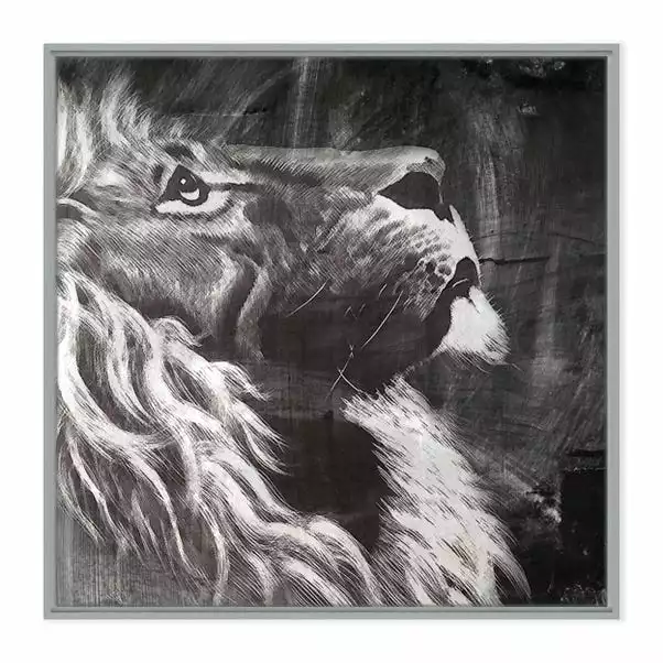 Display this majestic lion print in your home for a hint of power and intensity. This artwork illustrates a line drawing style technique to create a detailed monochrome canvas print in a square format and with a subtle silver frame to bring a contemporary touch to your home.