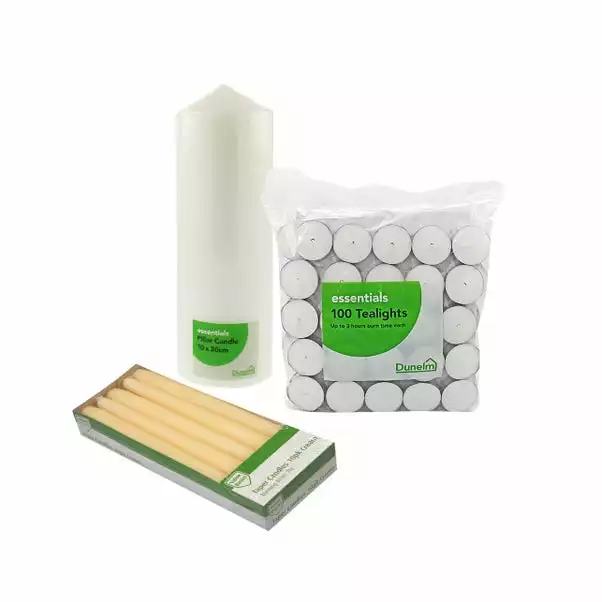 | Pack Contents | 1 x Pillar Candle, 10 x Taper Candles, 100 x Tealights |