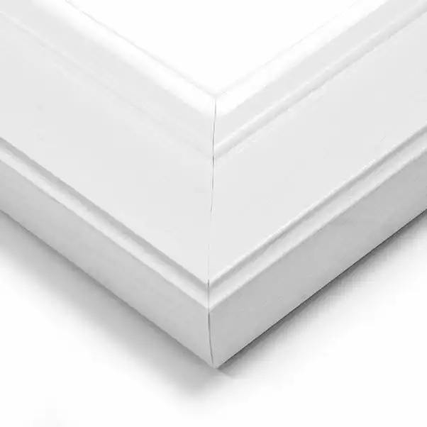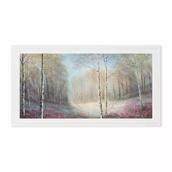 Bring this artwork of trees in a blossoming spring scene to your living room for a statement piece which emanates freshness with placid stillness. Presented in a wide landscape format, this impressive piece has a clean white frame and insert to add bring decoration and clarity to your home.