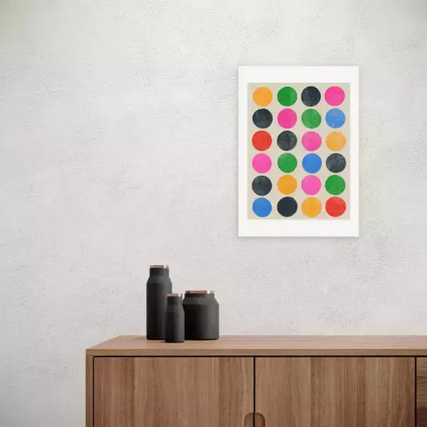 Bring a pop of colour to your living space with this bright, fun and simple print featuring repetitive circle shapes in vivid and uplifting colours. Made using a Giclee printing process to prevent fading, this wonderful print will stay vibrant for years to come. Each design is available in four print sizes and a variety of frame options, including unframed, so you can display your artwork however you wish.