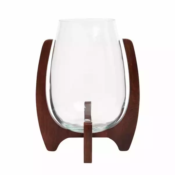 Featuring a modern and elegant glass design with a walnut wood stand. This stunning Elements Sculpted Walnut Lantern on Stand would make a stylish addition to your home décor. Beautifully crafted from glass and walnut wood. This elevated piece serves decorative value with its stylish pattern and practical design, perfect for displaying a candle within. This piece is perfect for complementing an array of rooms in your home.