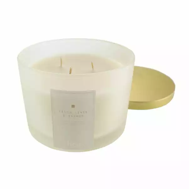 This modern linen fragrance opens with fresh citrus and leads to a white floral heart of lily and jasmine. Bamboo accords are complemented with white musk, vanilla & oak moss. This candle is encased within a frosted glass vessel with matte gold trims. A matte gold effect lid can double as a base for the multiwick candle to sit on. This candle can burn for up to 34 hours.
