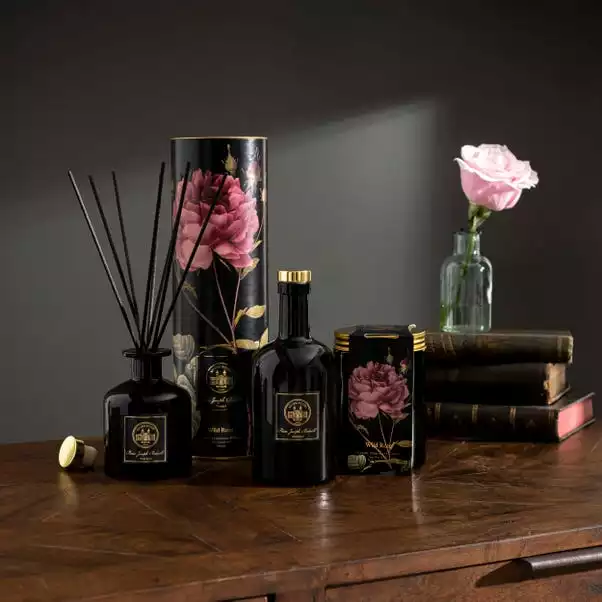 An infusion of rich rose and peony with sparkling mandarin and juicy orange facets merge with elegant notes of amber, patchouli and sensual musk. The Wild Rose Candle lasts up to 65 hours and comes in an eye-catching black candle jar with screw top gold metal lid. Keep and re-use this glass vessel once the wax has melted.